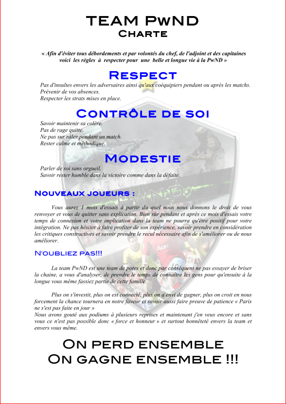 La team PwND est entrain d'écrire les première page de son histoire sur le site "LNP" ou elle cherche a faire de bon résultats et a se hisser parmit les plus grande team. Une team créer par PwND I LordZ I avec son adjoint PwND I levidad le 18.03.2011 depuis de nombreux membre les on rejoint.
